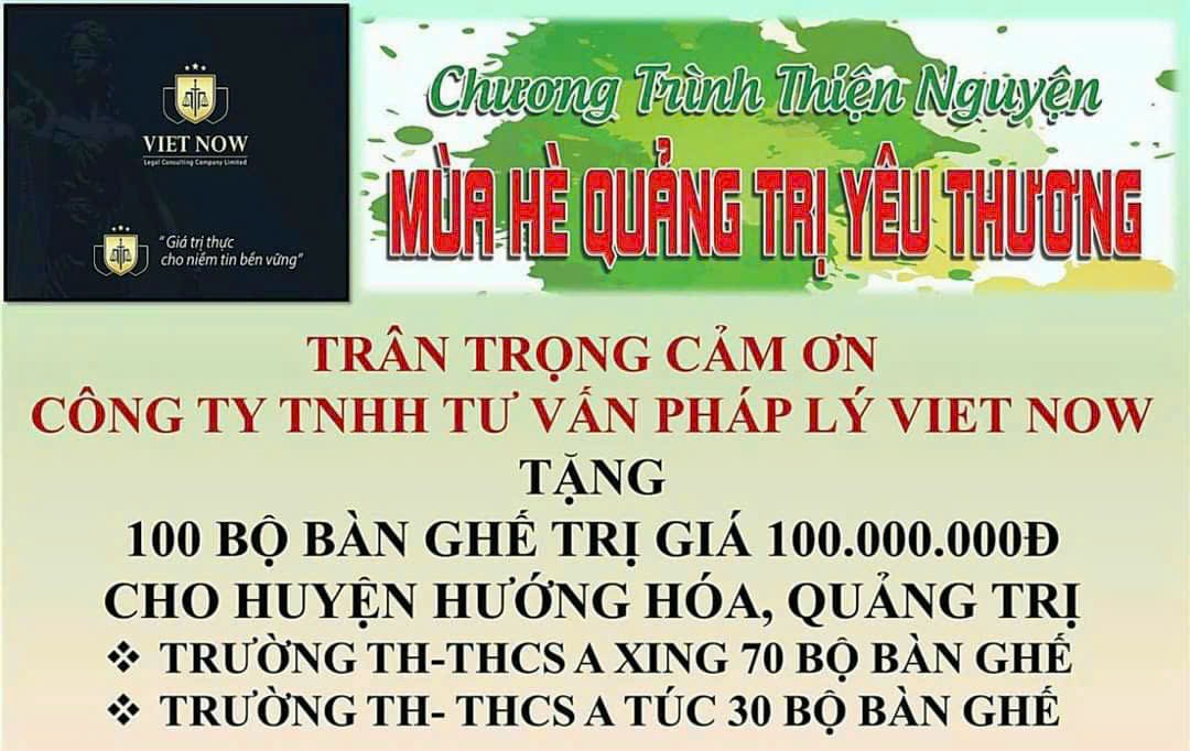 Để kịp thời chia sẻ, động viên và hỗ trợ nhà trường vượt qua khó khăn , Công ty TNHH Tư Vấn Pháp Lý Viet Now cùng kết hợp với nhóm thiện nguyện đã tiến hành đến khảo sát. Đến đây, đoàn từ thiện thấu hiểu và nhận thấy những khó khăn trong việc dạy và học của 2 điểm trường. Chúng tôi và những người bạn đã phối hợp với nhóm thiện nguyện tổ chức chương trình “Mùa hè Quảng Trị yêu thương”, trao nhiều phần quà cho các trường học, học sinh trên điểm trường.