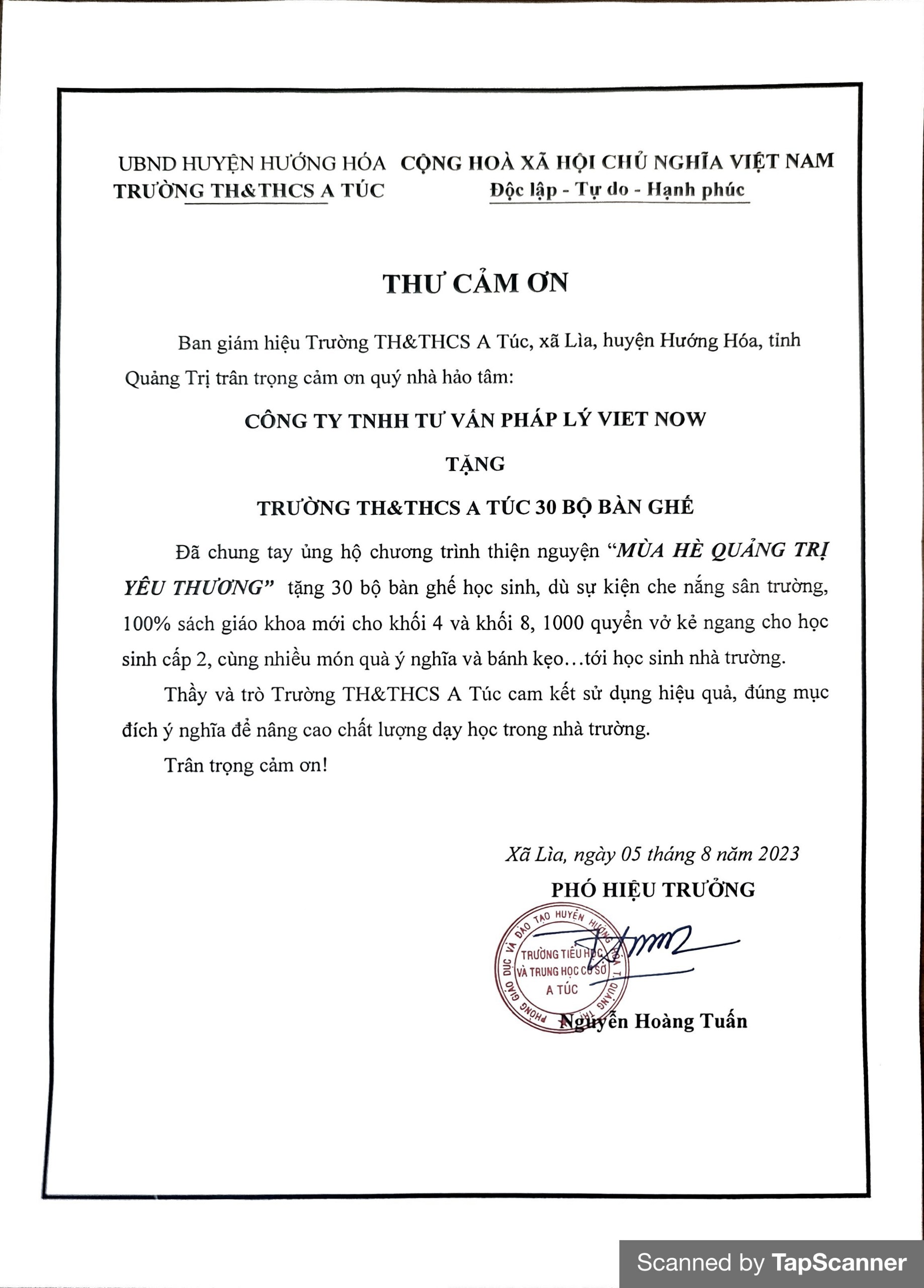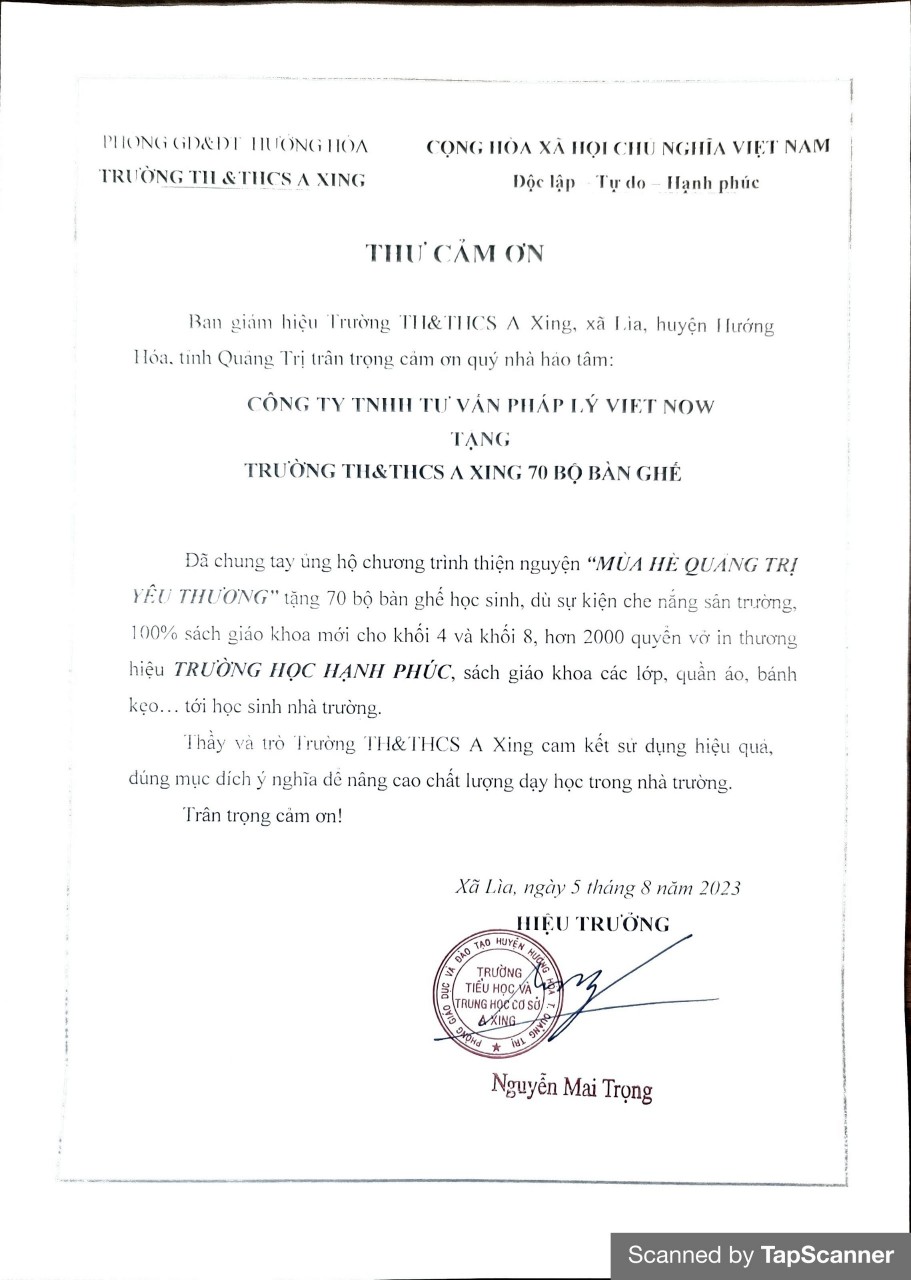 Tổng kinh phí tổ chức chương trình lần này riêng với Công ty TNHH Tư Vấn Pháp Lý Viet Now là 100 triệu đồng trong đó: 70 bộ bàn ghế cho trường TH –THCS A Xing; 30 bộ bàn ghế cho trường TH – THCS A Túc. Qua đó góp phần giúp các trường học, học sinh và người dân trên địa bàn vượt qua điều kiện khó khăn, đồng thời giúp cho các em học sinh có thêm điều kiện để đến trường trong năm học mới.